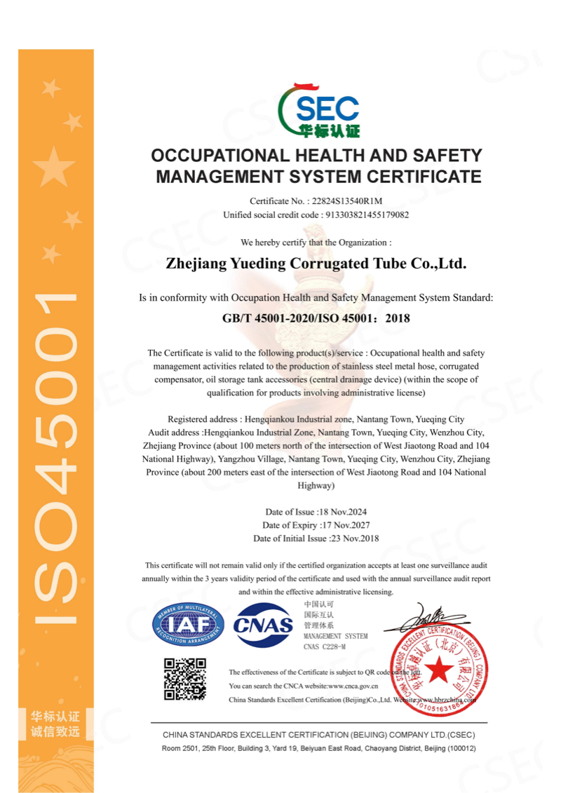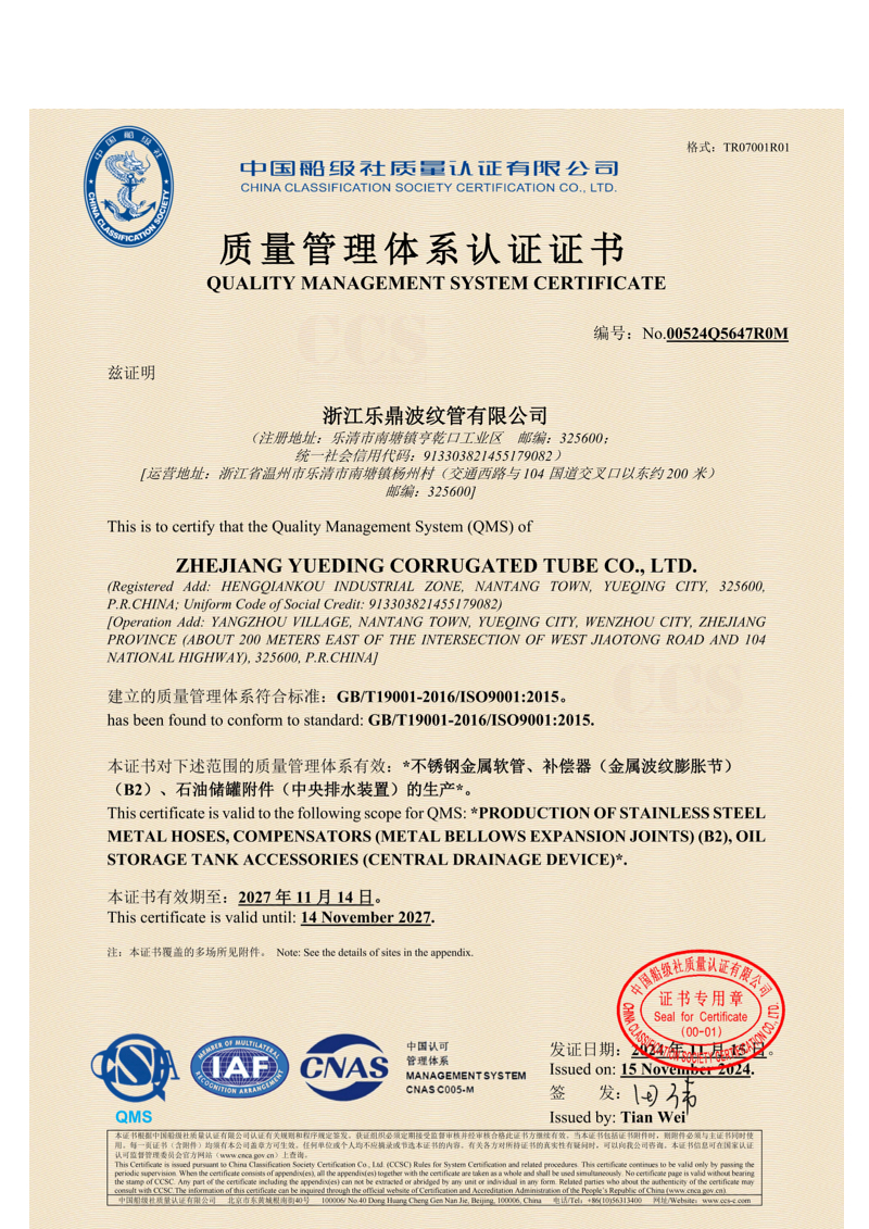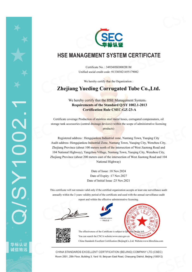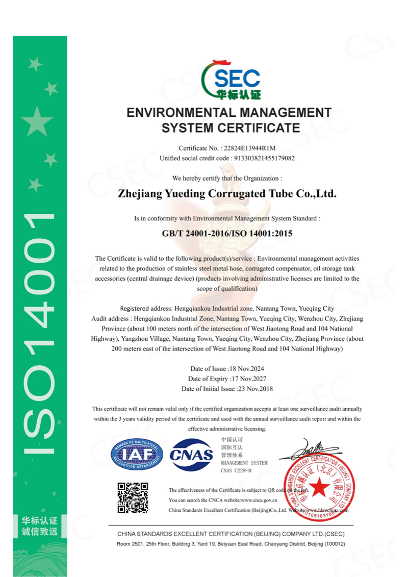 Company has passed ISO9001 and ISO14001 quality management system certification, as well as IATF16949 certification and others. In actual production, company implements GB/T12777 “General Technical Conditions for Metal Bellows Expansion Joints”, EJMA (Expansion Joint Manufacturers Association standard) and other related technical requirements, and at same time establishes internal quality document system based on “Quality Manual”, “Quality System Procedure Compilation” and “Three-Level Documents”, to ensure all processes execute same standards under different batches and different production periods.